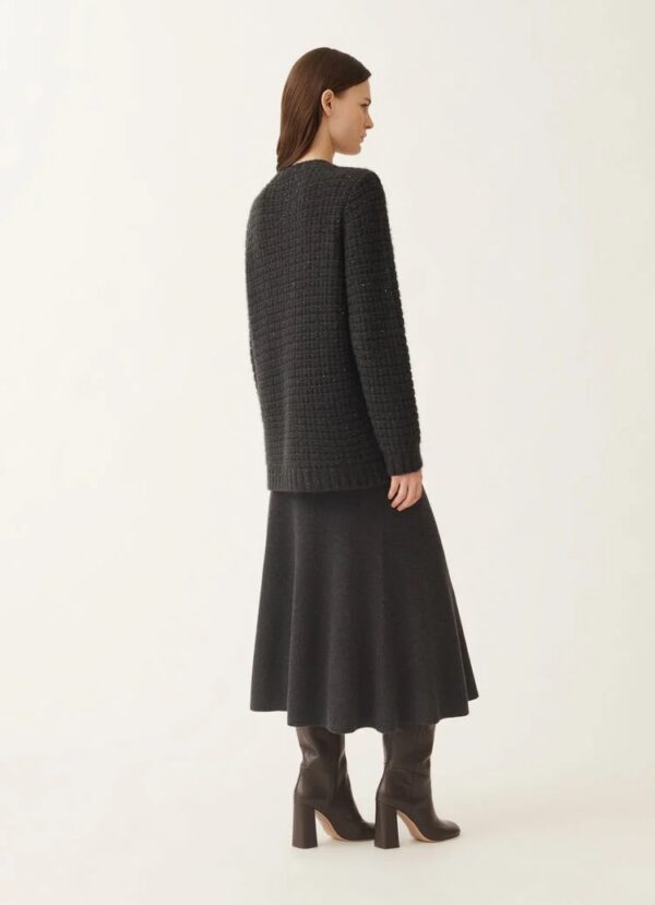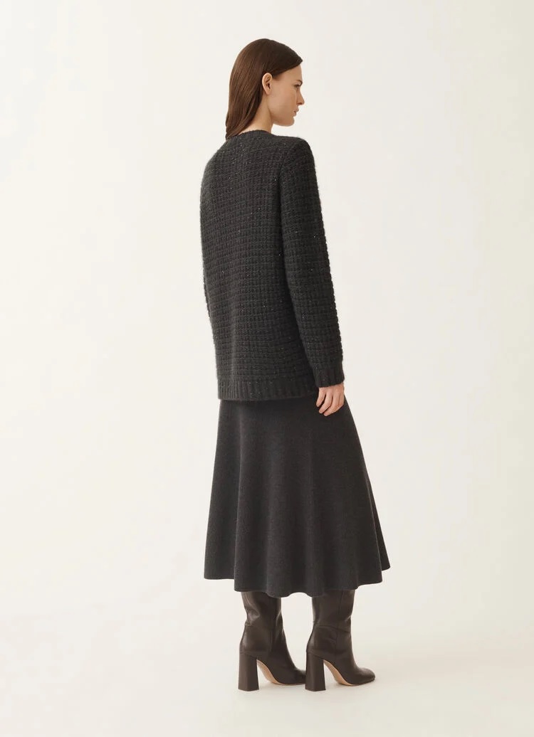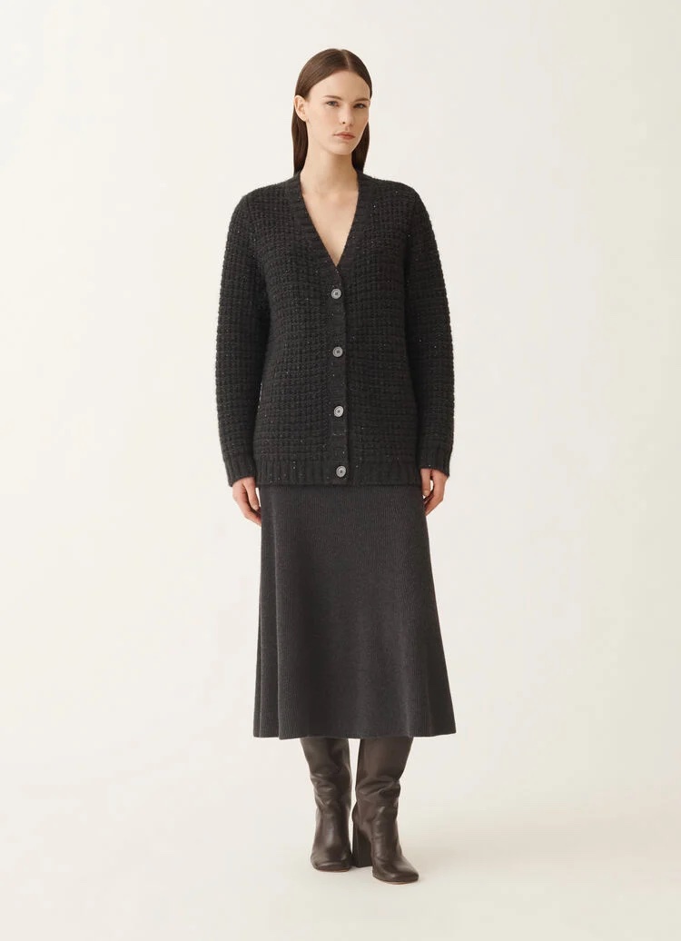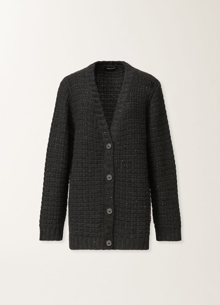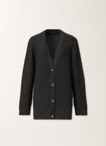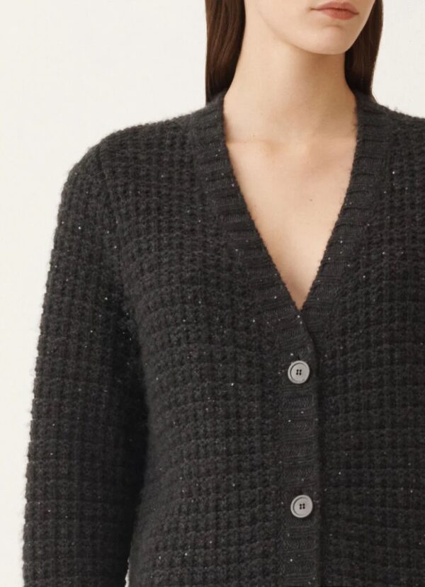 Elegantní kardigan v nádherném hlubokém antracitovém odstínu, jemně prosvětlený flitry, které vytvářejí noblesní hru světla a jemně třpytivý efekt. Vyroben z patentované příze složené z 57 % vlny, 18 % hedvábí, 15 % kašmíru, 7 % alpaky a 3 % polyesteru, což zajišťuje měkkost, pohodlí a luxusní vzhled.