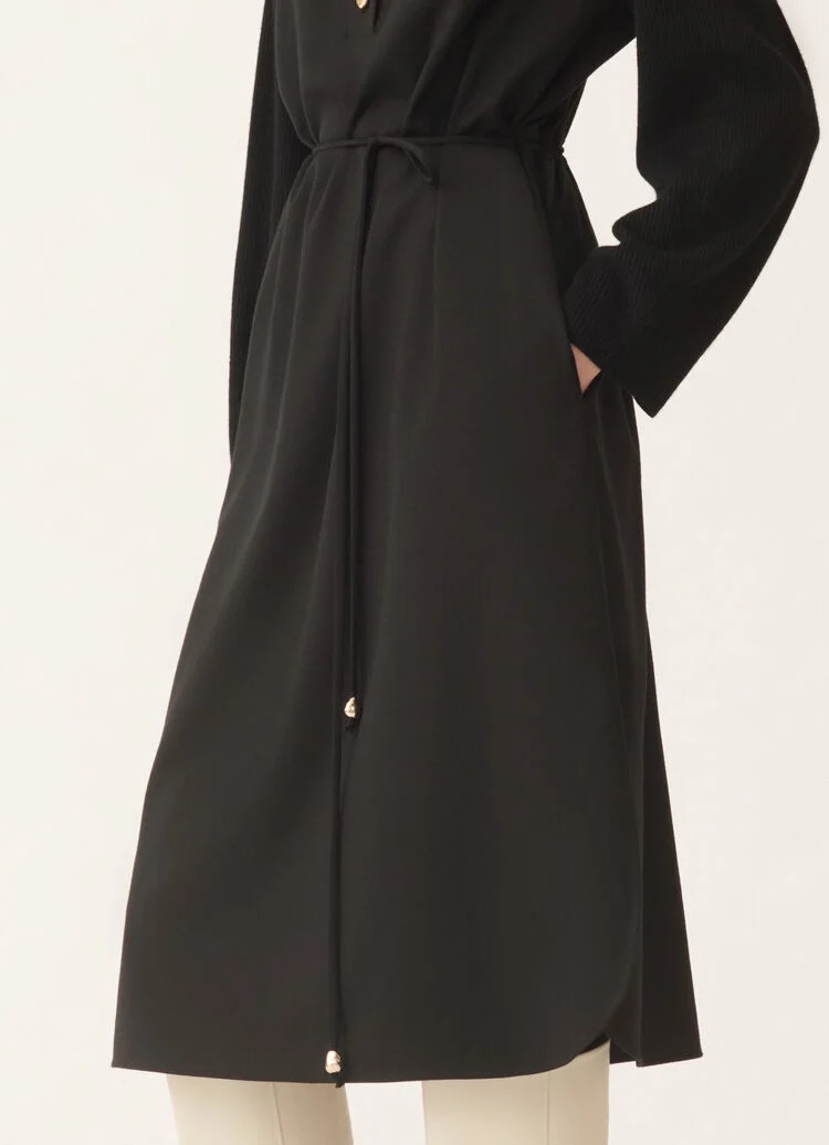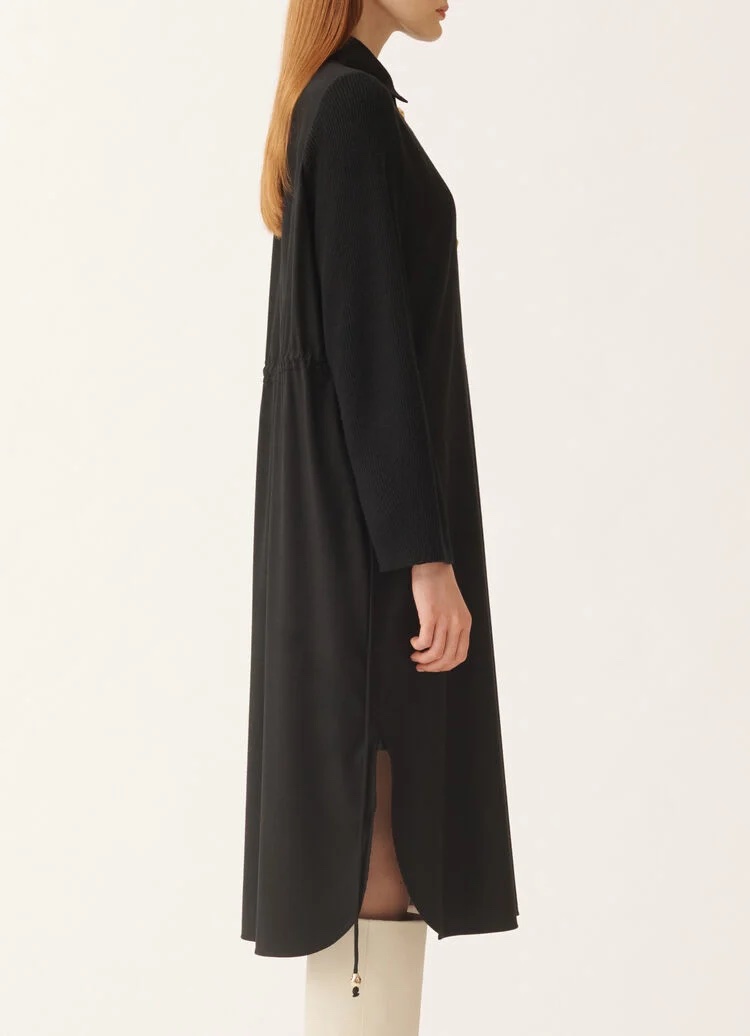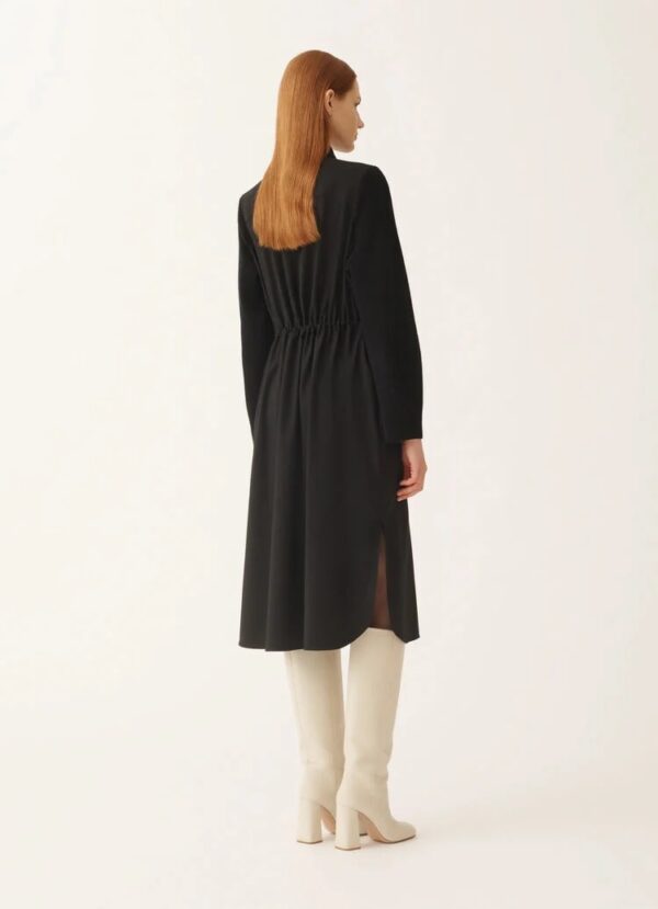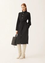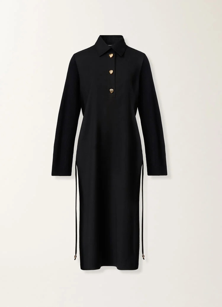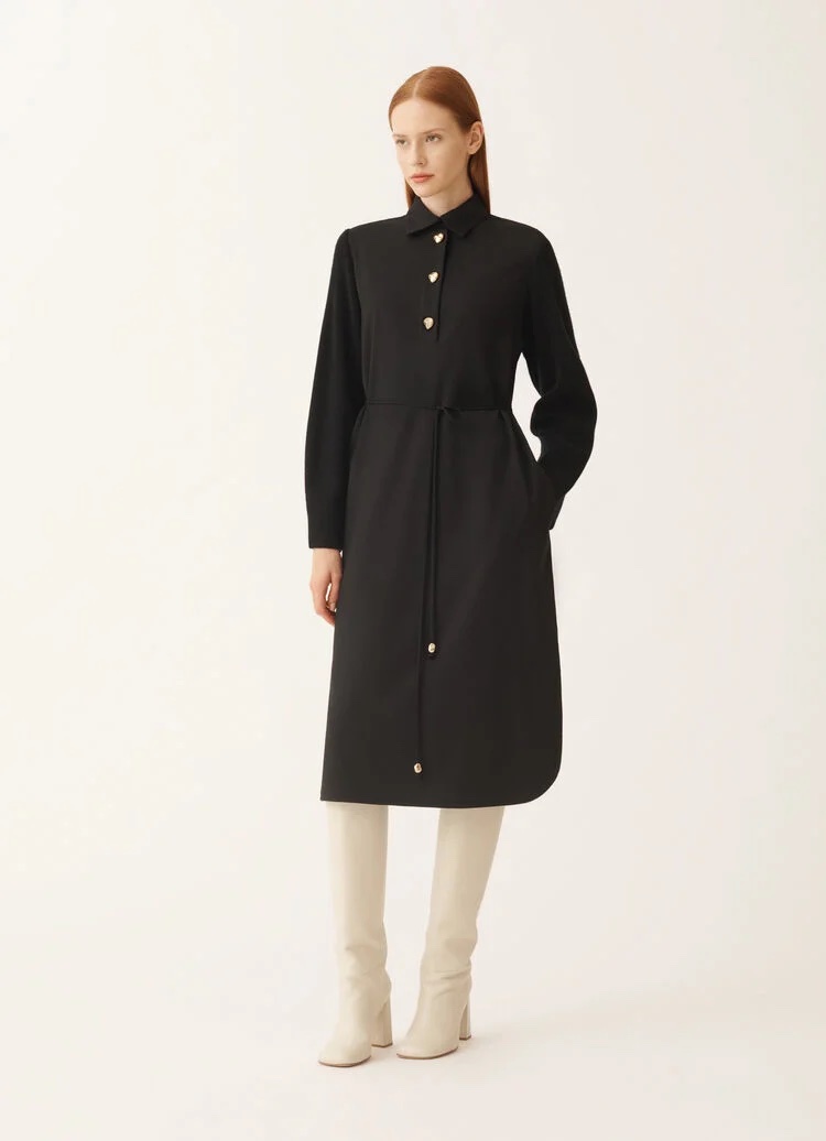 Stylové košilové šaty z luxusní směsi (90 % vlna, 10 % kašmír). Model je ozdoben třemi zlatými knoflíky, které dodávají jemný nádech sofistikovanosti a elegance. Nadčasový design pro moderní a sebevědomý vzhled.