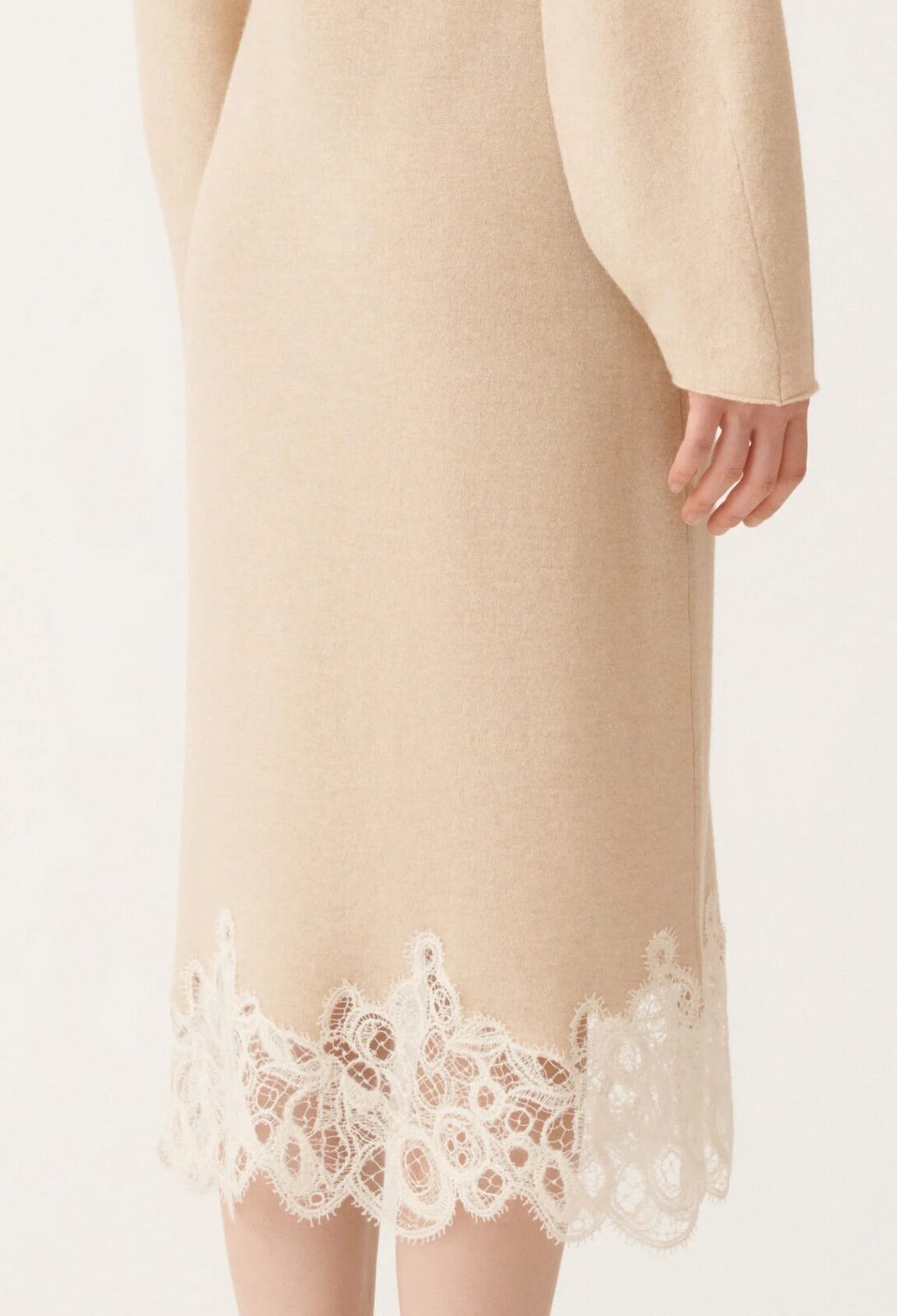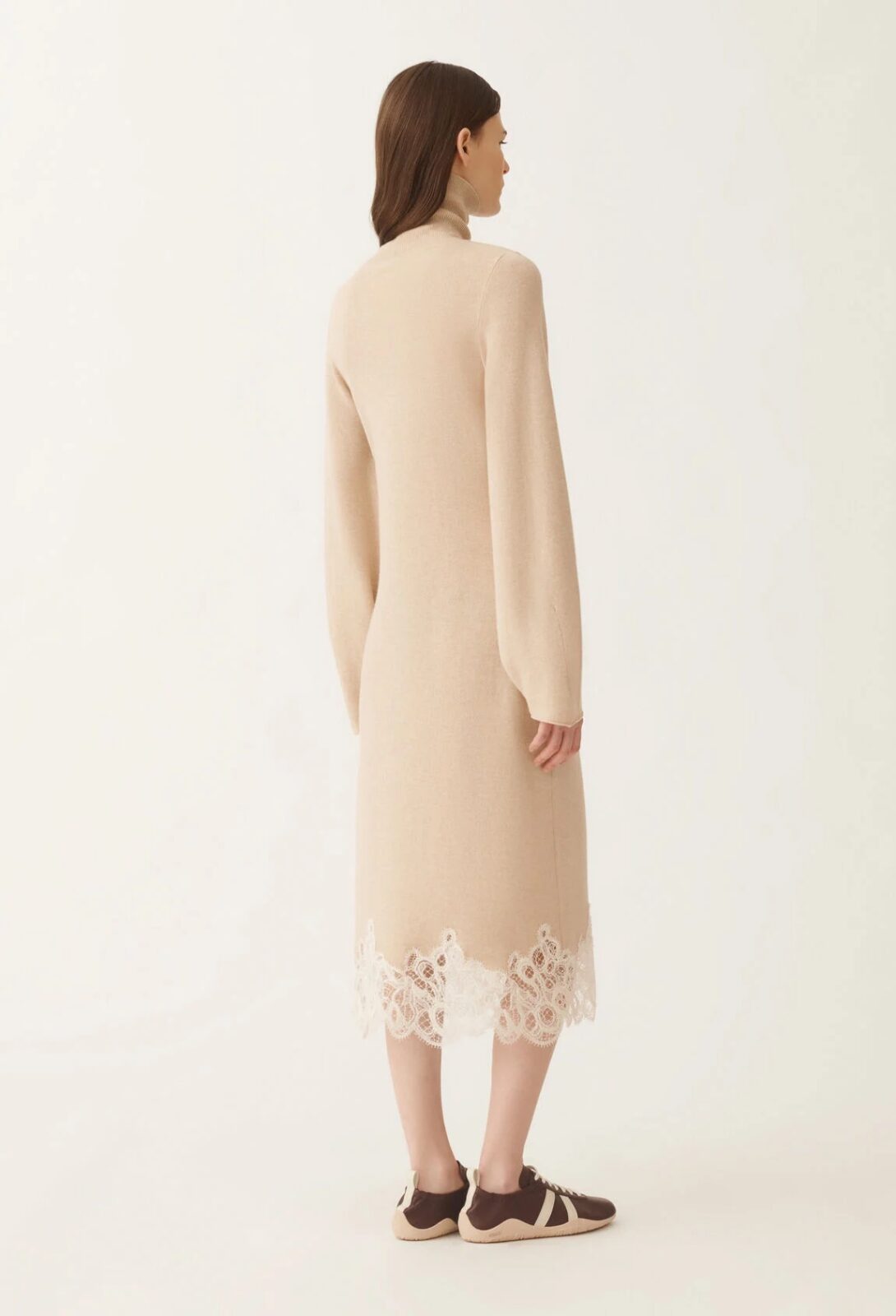 Elegantní šaty délky pod kolena v nádherném teplém béžovém odstínu, vyrobené z „platinové příze“ (75 % vlna, 15 % kašmír, 10 % hedvábí). Patentovaná příze zaručuje, že se nevytváří žmolky, možno prát v pračce – bez kompromisů na kvalitě. Spodní část modelu je zdobena florentskou krajkou z bavlny a vlny, která dodává šatům jemnou eleganci a sofistikovaný vzhled. Nadčasový střih a luxusní detaily podtrhují styl pro sebevědomou ženu.