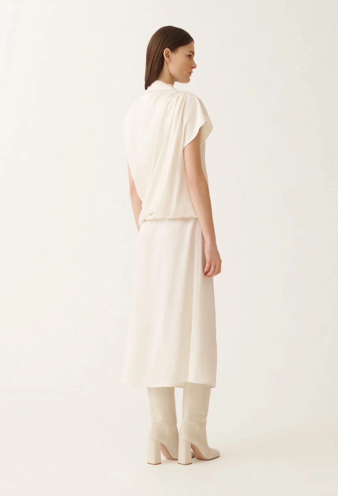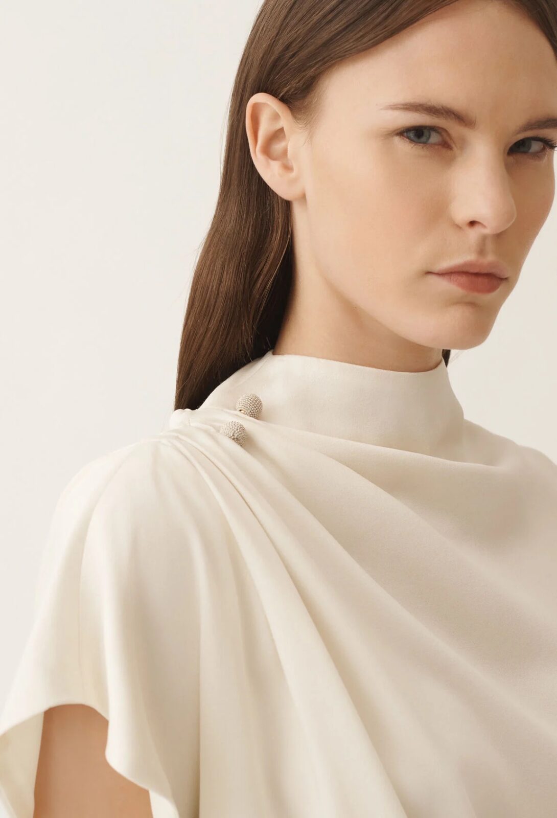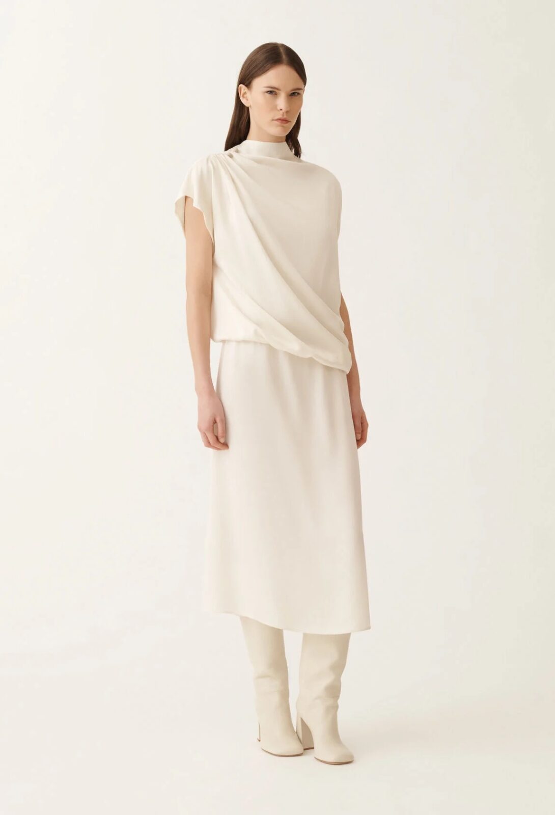 Elegantní večerní šaty v teplém zlatavě béžovém odstínu (není mléčný, jako na obrázku). Model je ozdoben broží a disponuje krásnou drapáží a designerským střihem. Ideální pro koktejlové či večerní příležitosti. Nadčasová elegance pro sebevědomou ženu.