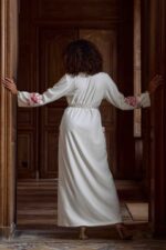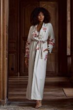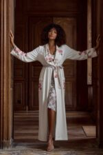 Elegantní dámský župan z hebkého veluru, zdobený jemnou krajkou. Rukávy a límec jsou dokonale zvýrazněny detaily z přírodního hedvábí, které dodávají modelu nádech luxusu a smyslné lehkosti. Ideální volba pro chvíle pohodlí i pro sofistikovaný domácí styl.