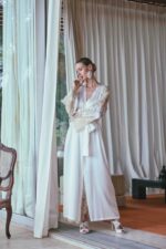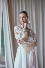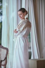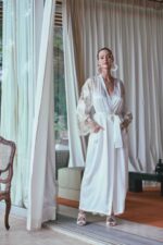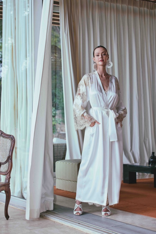 Dlouhý župan z bílého hedvábí, vyšívaný jemnou krajkou a guipurem. Luxusní materiály zaručují pocit elegance a sofistikovanosti – pocit jako u královny.