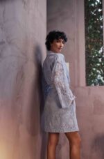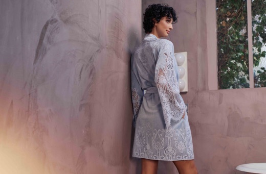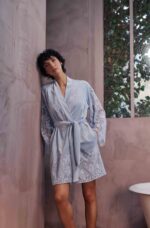 Krátký velurový župánek zdobený jemnou krajkou v něžně modré barvě. Luxusní a mimořádně příjemný na dotek, ideální pro chvíle pohodlí a elegance.